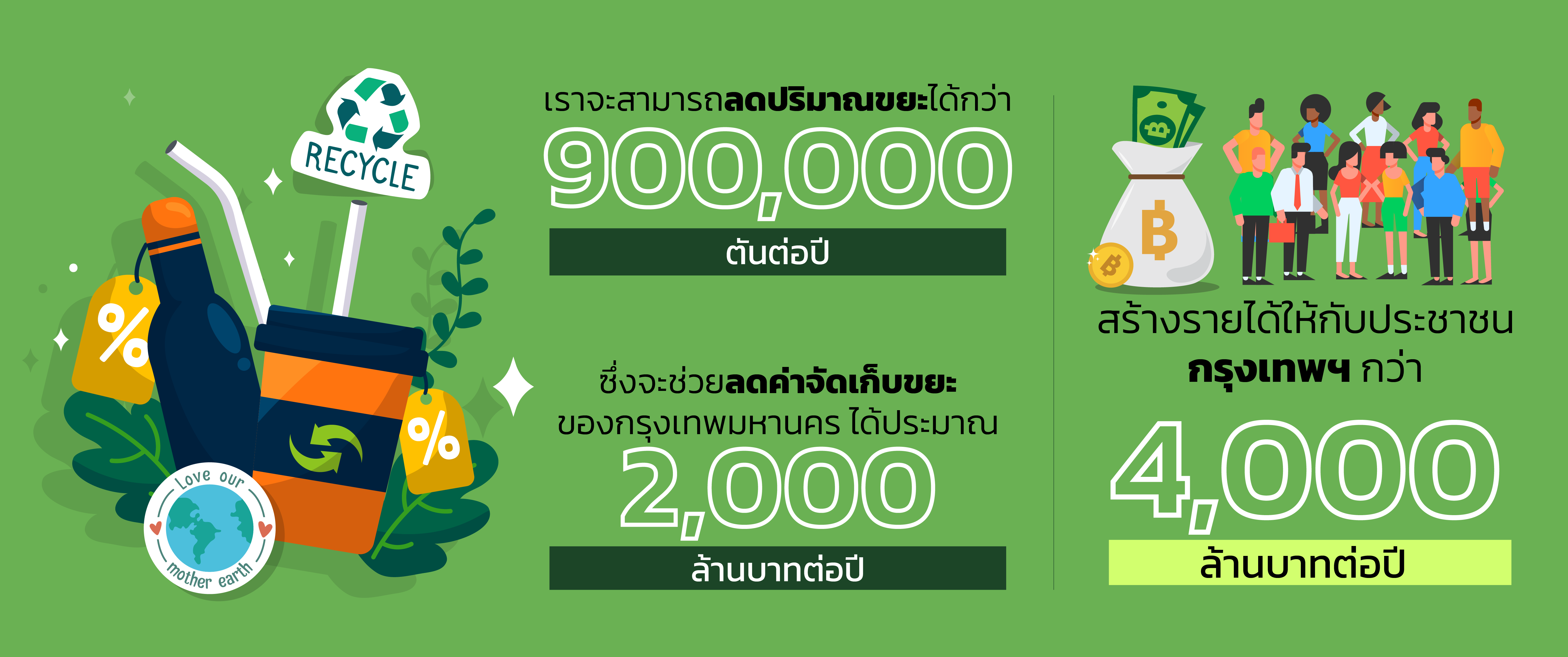 เราจะสามารถลดปริมาณขยะได้กว่า 900,000 ตันต่อปี ซึ่งจะช่วยลดค่าจัดเก็บขยะของกรุงเทพบหานคร ได้ประมาณ 2,000 ล้านบาทต่อปี