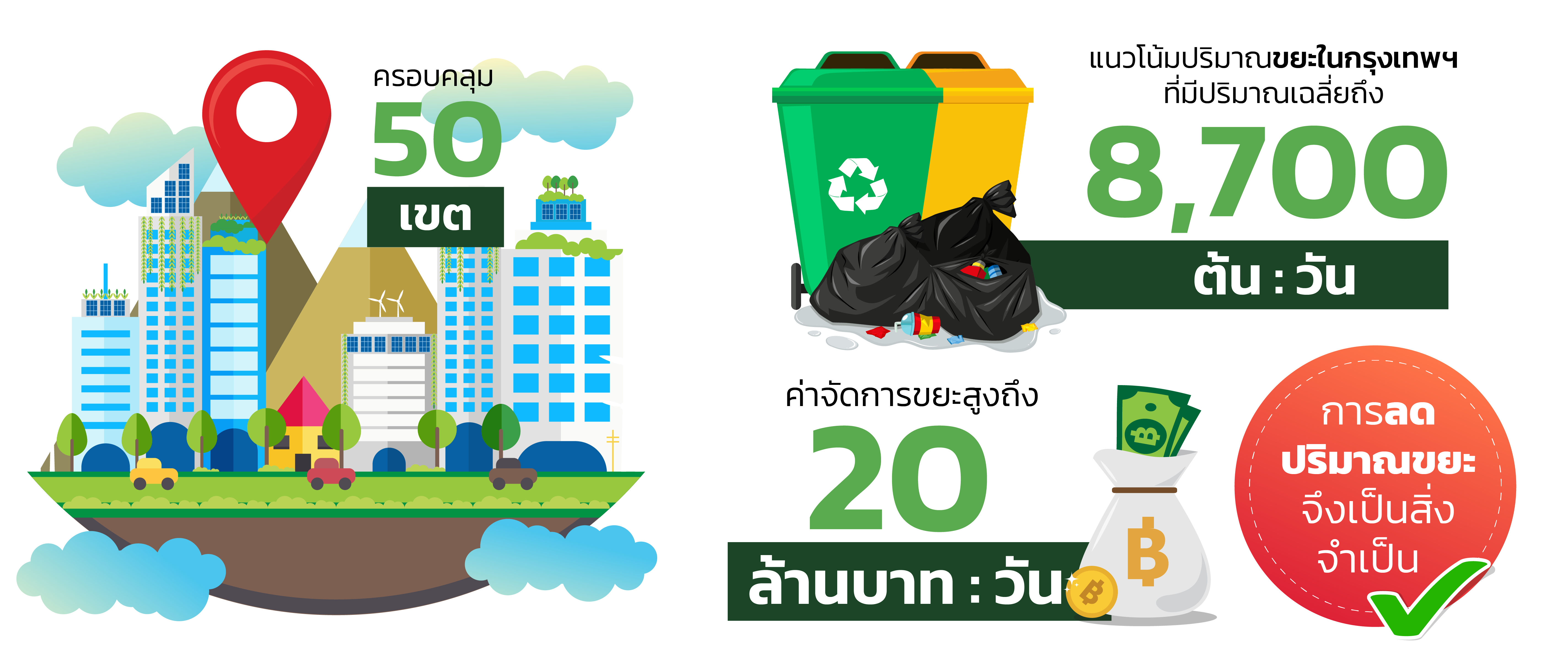 - ด้วยแนวโน้มปริมาณขยะในกรุงเทพฯ ที่มีปริมาณเฉลี่ยถึง 8,700 ตันต่อวัน ค่าจัดการขยะสูงถึง 20 ล้านบาทต่อวัน การลดปริมาณขยะจึงเป็นสิ่งจำเป็น